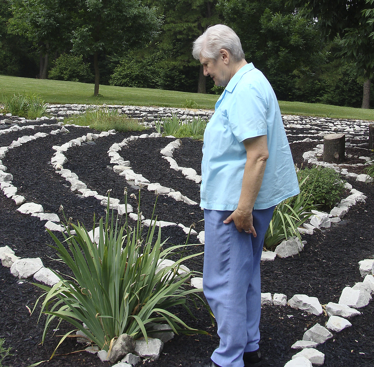 Sister Corlita Bonnarens walks the outdoor labyrinth at Mercy Center Campus in St. Louis, Missouri.